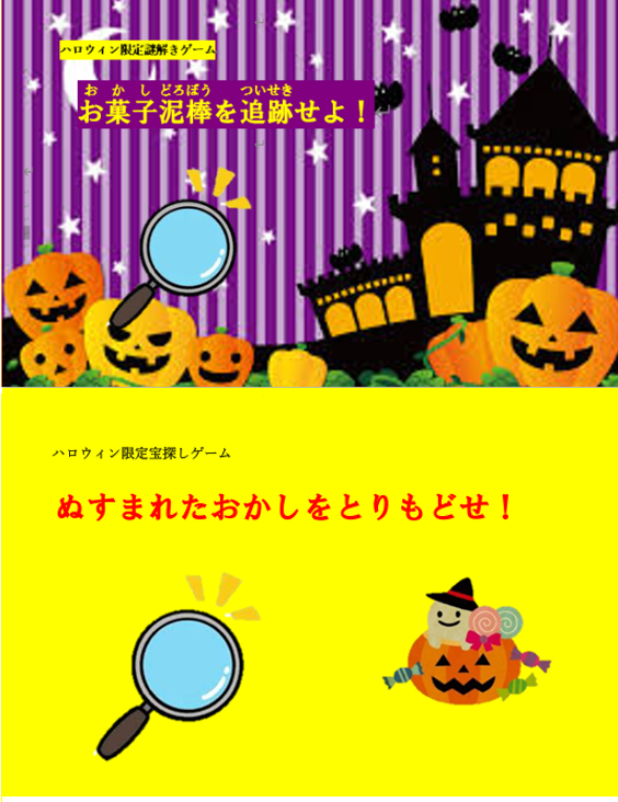 まだまだ残暑が続きますが、昨年好評だった ハロウィン向け宝探しゲーム と 謎解き宝探しゲーム を今年も公開します!