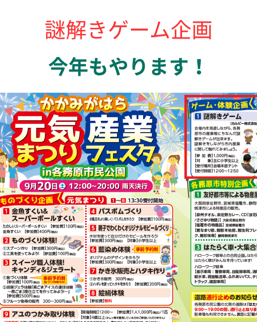 9月末にある各務原市の元気祭り産業フェスタの謎解き依頼の方も今週で完成予定なので、来週から新アトラクション作りに取り掛かっていければと思います!